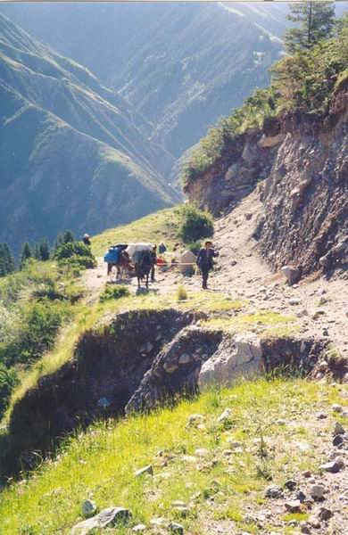 тропа через отрог в долину Чон-Терена. У моста сидят ребята. Мы