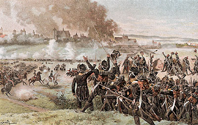 Расправившись с папой, Наполеон приступил к последним военным приготовлениям. 2, 3 и 4 июля император перевел новые корпуса на остров Лобау и туда же велел перевезти больше 550 артиллерийских орудий. 5 июля Наполеон приказал начать переправу с острова Лобау на левый берег. Кроме прежней, пополненной армии, у него был теперь и еще подтянутый из Италии корпус Макдональда. Битва началась 5 июля 1809 г., и началась не так, как ждал эрцгерцог Карл, и не там, где можно было с большим вероятием ее ждать. У Наполеона было твердое правило: не делать того, чего может ждать враг. У французов было около 550-560 пушек, у австрийцев - несколько больше 500. Артиллерия с обеих сторон была прекрасно снабжена снарядами. Переправа массы войск через Дунай была совершена исключительно организованно. Битва была необычайно жестокой, и 5-го, а особенно 6 июля были моменты, опасные для Наполеона. Он находился в центре боя; маршалы Даву, Макдональд, Массена, начальник артиллерии генерал Друо действовали с такой отчетливостью, как редко бывает в таких колоссальных боях. После страшной канонады «колонна Макдональда», 26 батальонов в «каре», сторона которого равнялась тысяче метров, неся огромные потери, прорывает центр австрийской армии. За ней следуют резервы. Далее, на севере маршал Даву, направленный императором на село Ваграм, расположенное на высотах, с боем вошел в село, и вся австрийская армия была вслед за тем разгромлена. К вечеру 6 июля 1809 г. все было кончено. Австрийцы были отброшены. Не все бежали врассыпную, часть их сохранила строй. Конечно, разгром, который потерпела австрийская армия под Ваграмом, был ужасающим, не меньше, чем под Аустерлицем. Австрийцы потеряли в этот второй день убитыми, ранеными и пленными около 37 тысяч человек. Но и французские потери были велики, хотя и меньше, чем потери побежденных. В этом смысле победа была куплена дорого. В течение почти всей следующей недели продолжалось преследование разбитой австрийской армии. Наполеон двигался вслед за кавалерией, добивавшей отдельные австрийские части. Когда 11 июля он вступил в г. Цнайм, ему доложили, что у него испрашивает аудиенции князь Лихтенштейн, только что приехавший генерал-адъютант императора Франца. Франц просил о перемирии. Наполеон согласился, но на очень тяжких условиях: все те части Австрии, куда проник к моменту перемирия хоть небольшой отряд французов, очищаются немедленно австрийцами и остаются в залог в руках французов, пока не будет заключен окончательный мир. Лихтенштейн согласился на все условия.