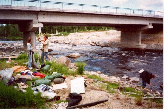 Рыбак, стоящий на мосту, помогает разобраться - нас выбросили на нужную реку, но километров на 10 ниже по течению. На карте обозначена старая дорога на Алаккурти, а все ездят по новой, которая проходит южнее. Благодарим судьбу за то, что избежали целый день шкуродера на этой речке с характерным названием (Каменная).