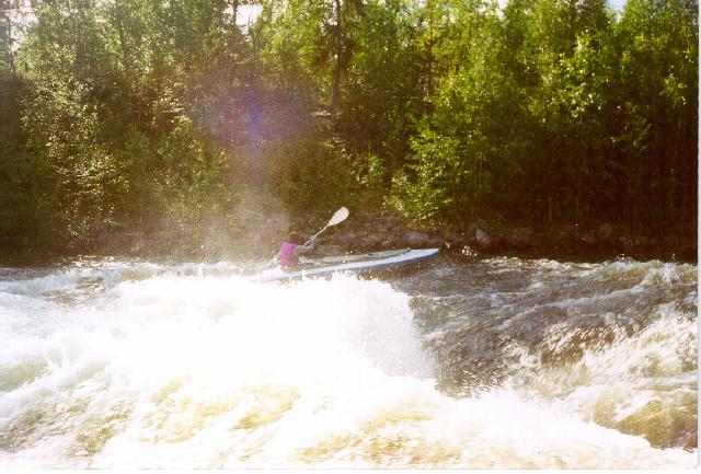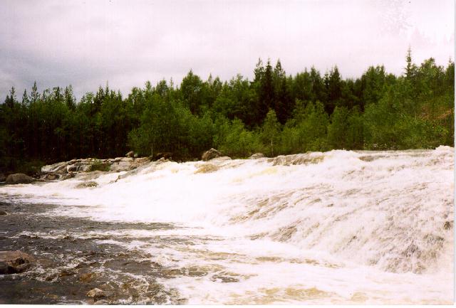 Проводимся вдоль левого берега. Есть ручеек и в обход моста. После пары сотен метров проводки удается чуть-чуть проплыть между островами проталкиваясь уже по более мягкой шиверке. Перед поворотом, из-за которого доносится рев, экстренно чалимся. Время близко к 9-ти вечера. Ну, дальше, как всегда, обнос около несколько сот метров по болотной тропе по левому берегу на берег озера Ориярви. Уже в полном дауне мельком смотрим на главный слив. Все 16 метров высаживаются на эффектном, изогнутом, более или менее ровном сливе максимум 100 метровой длины. Увы, освещение и состояние не позволили это сфотографировать. Более опытный напарник - Сергей - сказал: У! здесь можно покататься (на Т2). На следующий день этого желания не проявилось :-). В целом, слив выглядел менее драконовским в смысле камней, чем все остальное.