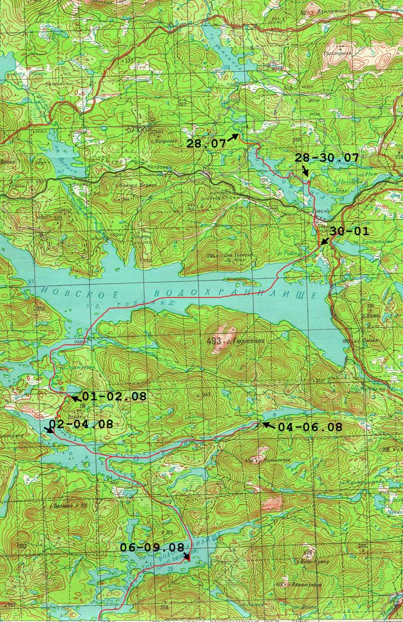 Маршрут выбрали по карте (по листам комплекта Северная Карелия 1:200000) подальше от обычных мест. Описаний в турклубе не нашли.