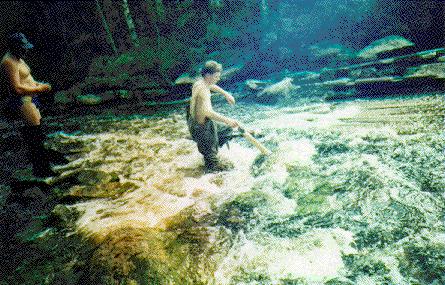 узкий глубокий метровый слив - желоб и затем проплыть несколько де-