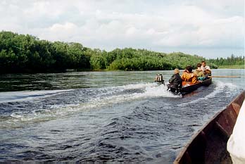 Первые 25 км (до Орловки) нас забросили на моторках вверх местные мужики коми-пермяки за какие-то очень небольшие деньги и 1.5 л водки. Моторки их замечательно оборудованы - под винтом чугунная "лыжа", на перекате она впаивается со всей дури в камни и далее не глуша мотора (!) на шестах.