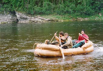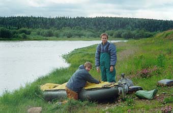 С утра все проспали. Встали около девяти утра. Настроение очень нерабочее. Васи очень тщательно собирали "Егеря". В результате вышли в 15.15. Река изобилует перекатами и порожками. Грести приходится очень мало. Вс? утро после дождя было яркое солнце.