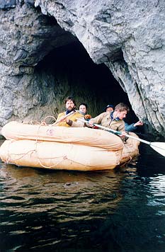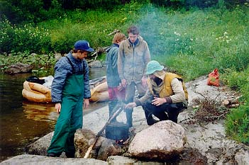Когда мы подходили к камню, оно было левее нас, а когда "Егерь" уже был слева от камня, ПСН вдруг оказался правее и "Егеря" и камня. Байдарку на его месте просто размазало бы по камню, а ПСНу хоть бы что (за весь поход ни одна надувная часть его не была пробита). Сполз правее камня и пош?л дальше. Правда, спящие в н?м получили утреннюю информацию о температуре и степени свежести воды и насладились предчувствием кораблекрушения и команды "Полундра". Встали на завтрак в 7.00 не доходя Средних ворот. Вскоре морось исчезла и вышло солнце.