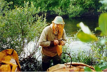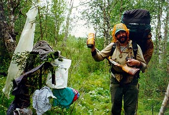С утра пораньше, завидев дым разведенного Васей2 костра, заявился инспектор нац. парка Гаврилов с ржавым ружьем и напарником Димой. Как выяснилось- это главный человек на этой реке. Он проверил документы и выпил чаю, насыпав в кружку примерно полпачки заварки. Затем он проч?л лекцию по кинологии, поведав об особенностях разведения западносибирских лаек. Поговорили о ловле рыбы. Гаврилов сокрушался, что трудно достать хорошие бл?сны. Пришлось подарить парочку. Заодно Кира презентовал ему два патрона. Напоследок инспектор Гаврилов одарил нас тремя малосольными хариусами и флакончиком репеллента, а Дима снял нас видеокамерой. Инспектор Гаврилов стал еще одним символом похода. Не проходило и дня, чтобы его имя не поминалось.