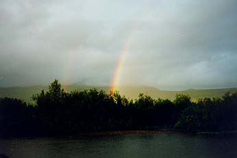 Встали в 19.00 на левом берегу с высокой травой. Сразу же развели кост?р и стали греться. На противоположном берегу была очень яркая радуга.