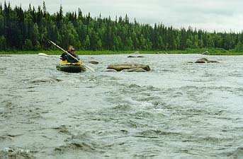 Как я уже сказал волок у нас был почти три дня - и не долиной (бурелом, кустарник), а через перевальчик по осыпям ... Вышли мы на ручей впадающий в Тельпос, вырубили в прибрежном ивняке площадку, надули прямо на воде ПСН - наконец-то сплав!!! Тельпос - практически сплошная несложная шивера, примитивная лавировка, даже и выделить в общем-то нечего ... 60-70 км - полтора дня.
